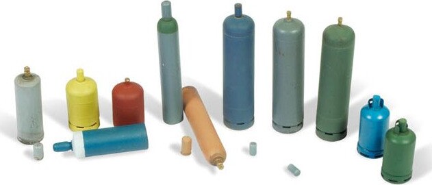 Modern Gas Bottles tilbehørssæt fra Vallejo indeholder elleve assorterede gasflasker i forskellige størrelser og med mange detaljer, herunder nogle enheder med separate dæksler, der viser...