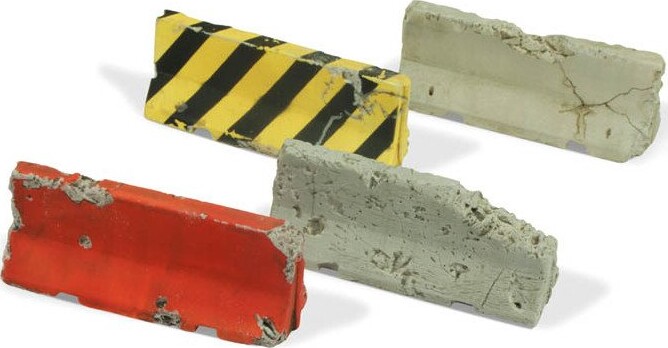 Sættet fra Vallejo indeholder fire beskadigede betonbarrierer af typen "New Jersey", et moderne design, der viser virkningerne af sammenstød og kollisioner. De beskadigede betonbarrierer...