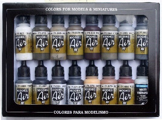 Vallejo - Model Air Maling Sæt - Weathering består af 16 x 17 ml flasker, der er perfekte til at skabe realistiske effekter på dine modeller. Dette sæt er specielt designet til weathering, hvilket gør det ideelt til at tilføje dybde og karakter til dine modeller, uanset om det er fly, biler eller landskaber. Vallejo er kendt for deres høje kvalitet og brugervenlige produkter, og dette maling sæt er ingen undtagelse. Med en fin pigmentering og en glat konsistens kan du let anvende malingen med pensel eller airbrush. Sættet indeholder forskellige nuancer, der giver dig mulighed for at efterligne slitage, rust og andre naturlige elementer på dine modeller. Uanset om du er en erfaren modelbygger eller nybegynder, vil dette sæt hjælpe dig med at realisere dine kreative visioner. Gør dine modeller mere livagtige og imponerende med Vallejo's pålidelige produkter, der sikrer et professionelt resultat hver gang.