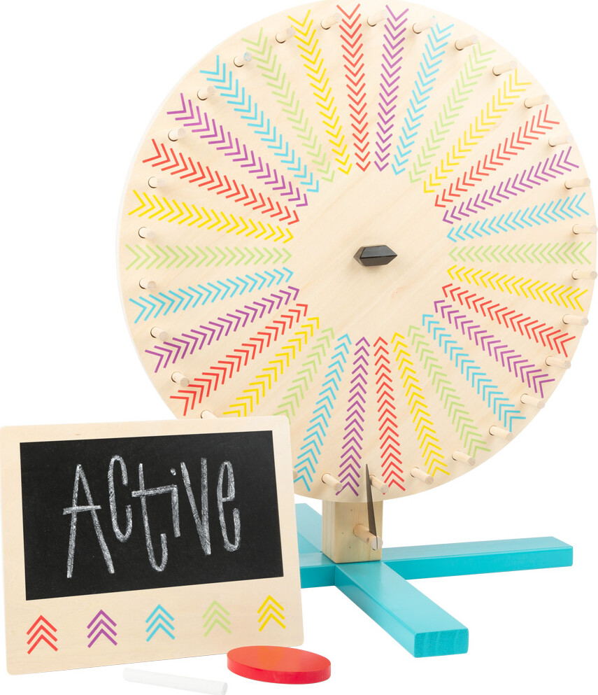 Dette lykkehjul i trę består af en plade, der nemt kan drejes og tilpasses. Den ene side har 30 farvede felter, mens den anden side er malet med tavlemaling. På tavlesiden kan du selv lave nye...