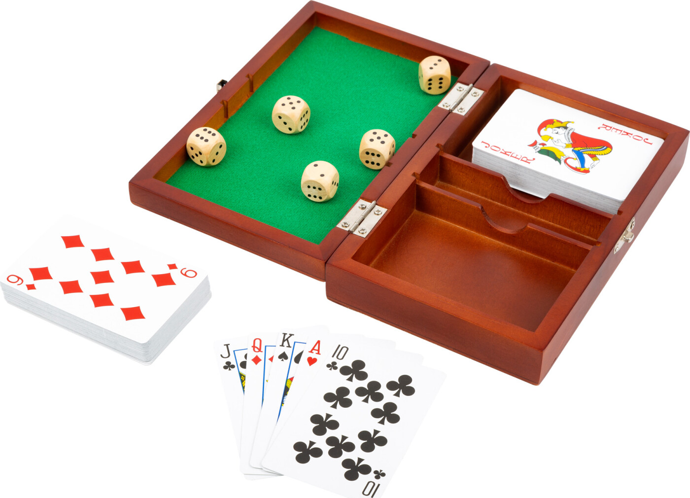 Spillesęttet indeholder to kortspil og fem terninger til spęndende runder med kort og terningespil. Med de to 54-korts kortspil kan klassiske spil spilles. Ęskens låg er foret med grųnt stof, og...