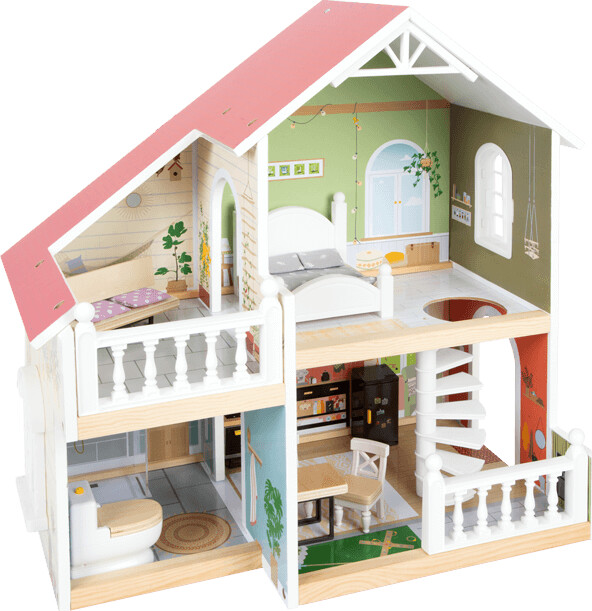 Dette moderne dukkehus i træ med åben front gør et fantastisk indtryk med kunstneriske detaljer, dekorative accenter og en moderne indretningsstil. En kombineret køkken-, stue- og spisestue, et...