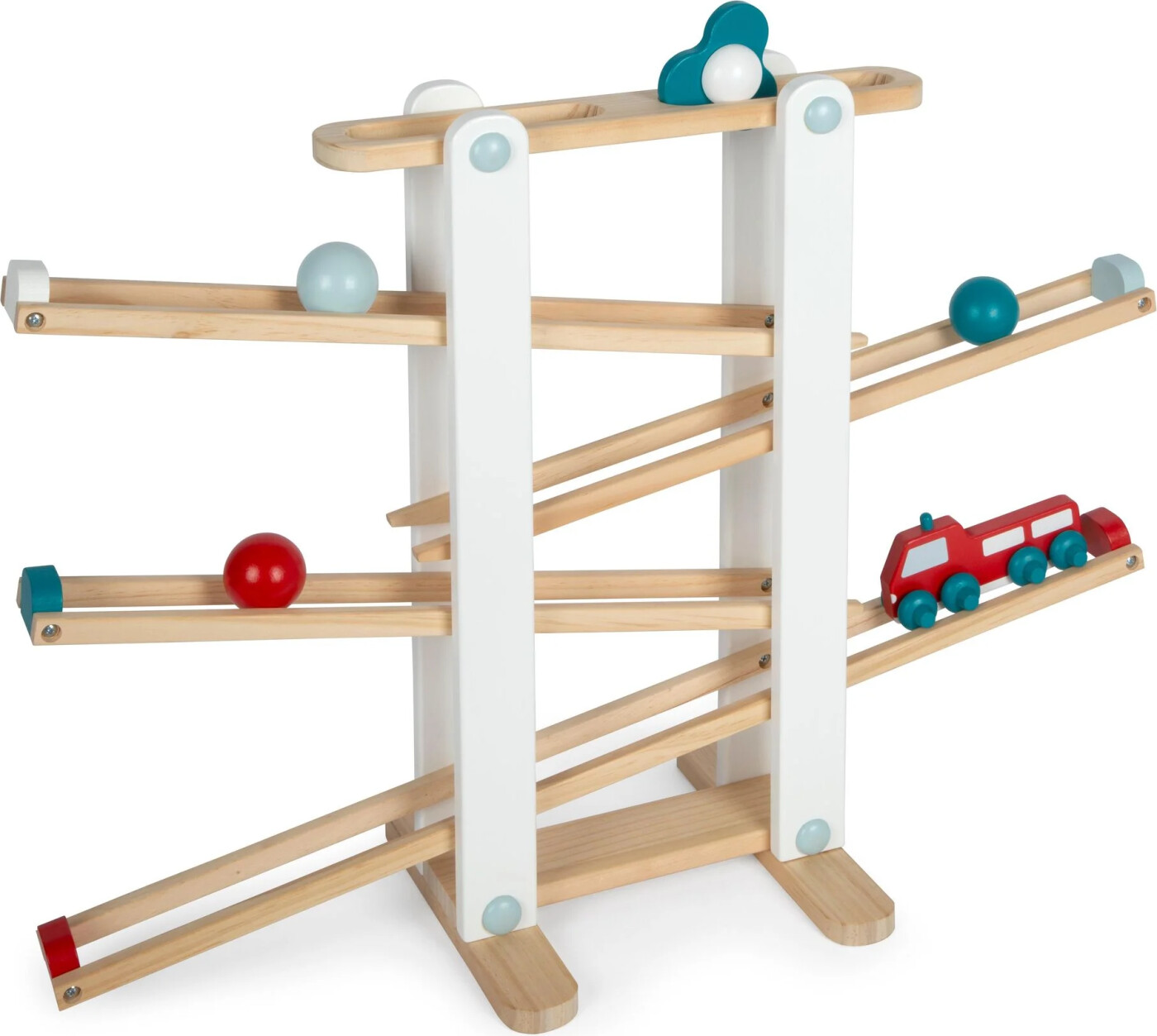 Hurtig Bil Kuglebane-action i XL-format! Når de 3 solide trękugler suser ned ad de fire ramper, er der garanteret timevis af sjov. Dette ekstra store, robuste lųb, lavet af massivt trę af hųj...