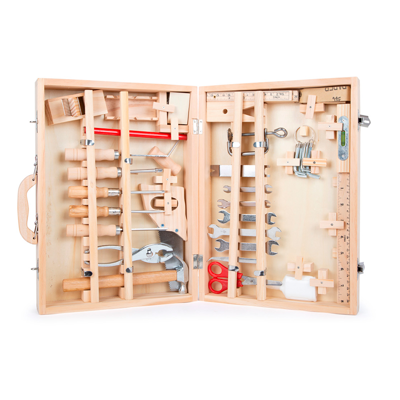 Et kæmpe udvalg af alt værktøj til arbejde i metal og træ. Alt har sin helt egen plads i værktøjskassen, så dit barn kan holde styr på sit grej. En stor del af at lære at være håndværker er at kunne holde styr på sit værktøj, og det er der rig mulighed for her. Det er ikke voksenkvalitet, men dit barn kan save, måle, slibe og høvle på rigtig vis og med godt resultat. Dit barn kan lære, hvordan alt det forskellige værktøj virker og skal håndteres.