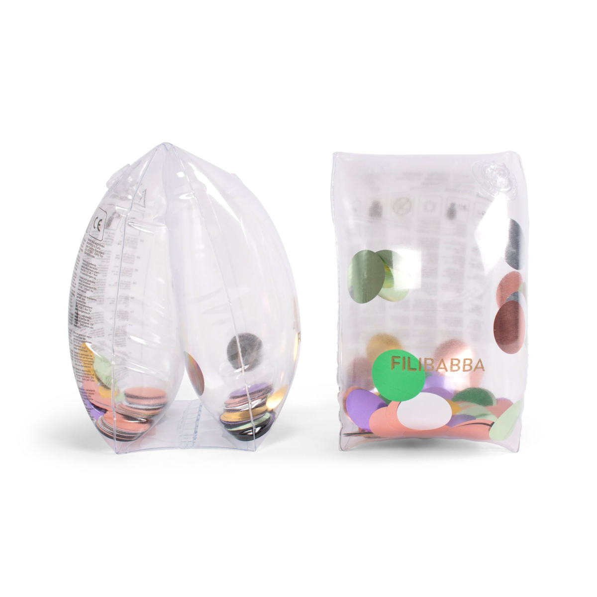 Med den sjove konfetti bliver det ekstra sjovt at have badevinger på i svømmeren eller ved stranden som lidt ekstra tryghed til nye vandhunde. Pust op gennem sikkerhedsventilen, som du kan trykke ind i badevingerne bagefter, så de ikke er generende. Husk altid at holde dit barn under opsyn i vandet.