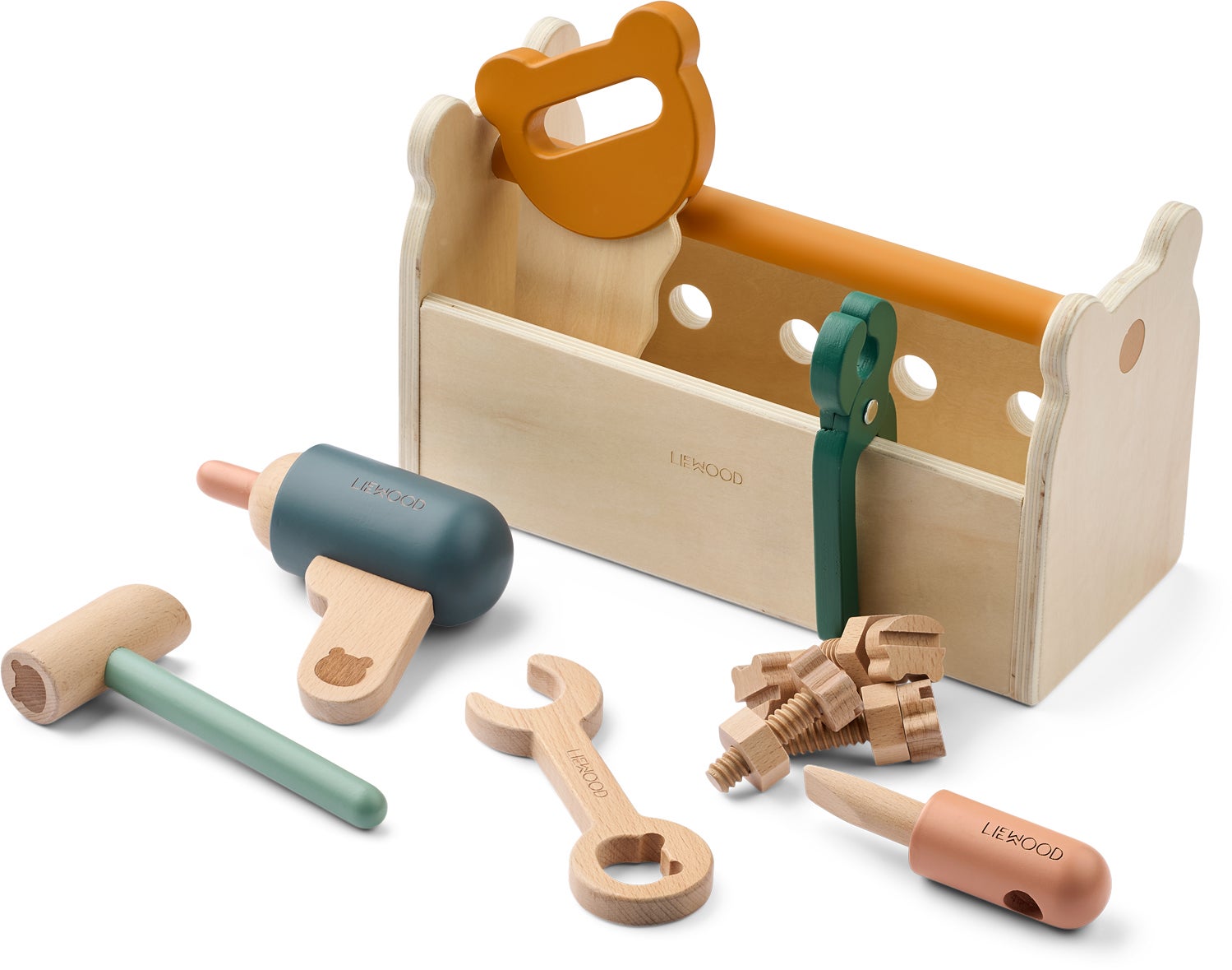 Værktøjskasse fra LIEWOOD med mange forskellige værktøjer til at bygge med. Perfekt til mange timers sjov. - Indeholder: 6 værktøjer, 4 bolte, 1 værktøjskasse. - Let for små hænder at gribe om. - Let at opbevare. - Opmuntrer brug af finmotorik og stimulerer kreativitet og fantasi. - Rengøres på overfladen med en fugtig klud. - Godkendt i henhold til EN71. - CE-mærket. - Anbefalet alder: Fra 1,5 år. - Bøgetræ, krydsfiner.