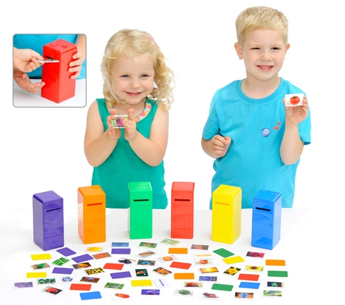 Med dette fine spil kan børn udvikle farvegenkendelse, sorteringskompetencer og finmotorik - og hvilket barn ELSKER ikke at putte ting i en postkasse?Postkasserne - 6 stk. - er i klare, fine farver: rød, gul, blå, grøn, orange og lilla. På de 60 kort med dobbelte sider er der flotte fotos af virkelige ting. På bagsiden er den farve, der passer til genstanden på kortet. Barnets opgave er nu at identificere farven på kortet og placere brikken i den korrekte postkasse. Kortene måler 5 x 3,5 cm. Postkasserne måler 14 x 6 x 6 cm.