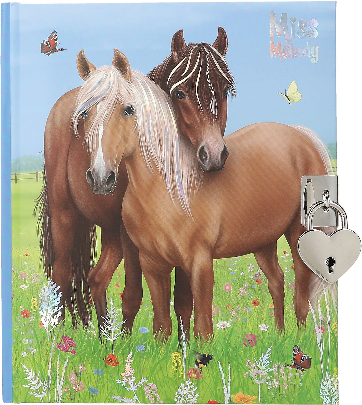 Dagbog fra Miss Melody med et hestetema. Den har mange sjove klistermærker til ekstra dekoration. Perfekt til kreative stunder. - Indeholder: 1 dagbog, 1 hængelås med nøgle, 1 ark med klistermærker. - Sødt og sjovt design. - Linjerede sider. - Hjerteformet lås. - Klistermærker medfølger. - Anbefalet alder: Fra 5 år.