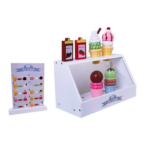 Med dette fine sæt af træ med masser af is og istilbehør kan dit barn lege isbod med sine venner. Det er hyggeligt i sig selv, og rollelege stimulerer fantasien og de sociale kompetencer. Men - netop den med at skulle bestille eller tage imod bestillinger som ismand/dame er faktisk en super god leg, hvis du har et barn, der er lidt genert overfor fremmede. Med sættet er der et flot sæt med isholdere og hylder til tilbehør og is - samt en bestillingsplakat med forskellige opskrifter pÄ.