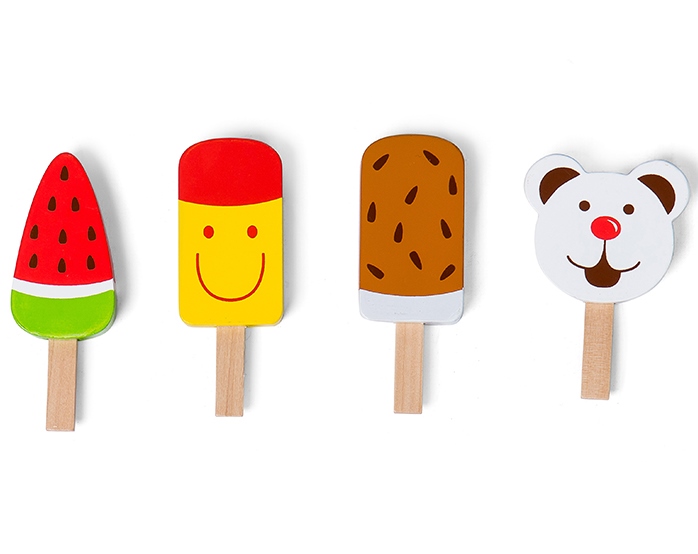 Så er der ikke noget med is, der lųber ned af hagen. De utroligt fine ispinde af trę kan bruges alene eller sammen med den meget sųde isbod, vi også har i Legeakademiets udvalg af legekųkkener og udstyr til legemad. Der er 4 forskellige is med i samlingen her, alle store bųrnehits: Bamseis, filur, vanilieis med chokoladeovertręk og en vandmelonis, der får mundvandet til at sejle. Ispindene er skųn leg både sommer og vinter, og når vi ikke rigtig orker, at tųjet bliver snasket ind i is. Eller lige fųr aftensmaden. Isene måler ml 9-12 cm. Fra 3 år, men yngre bųrn har også ględe af isene under voksent opsyn.