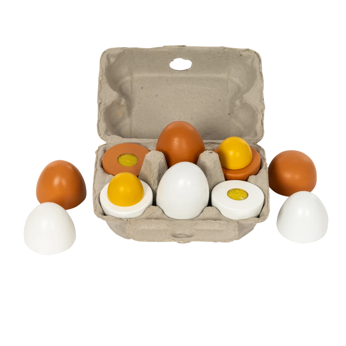 Hvor kommer ęgget fra? FInt sęt med hele ęg, hårdkogte ęg der kan skilles ad på midten, og ęg hvor man kan se hele ęggeblommen.De opbevares - naturligvis - i en ęggebakke.Af kinesisk tetrę og med velcro.