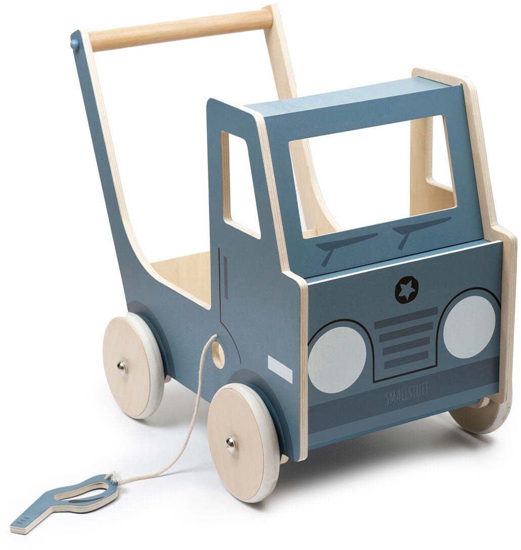 Gåvogn fra Smallstuff i træ med form som en lastbil. Den har fine detaljer og et benzindæksel med en slange og et håndtag. Gåvognen har stor opbevaringsplads til barnets ejendele og legetøj. CE-mærket. Anbefalet alder: Fra 12 måneder. Træ, plastik.
