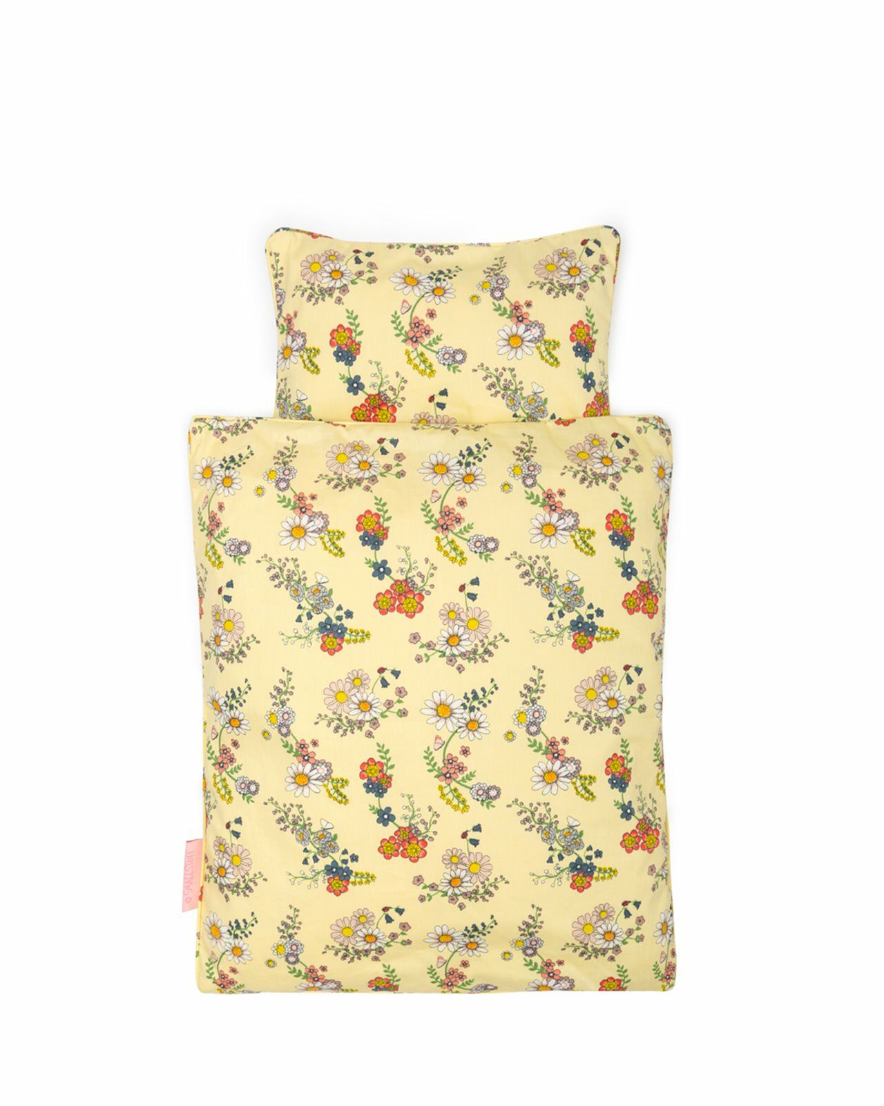 Dukkesengetøj fra Smallstuff med et blomstret print. Det har en dyne og en matchende pude. Dyne: 35x40 cm. Pude: 14x24 cm. CE-mærket. Anbefalet alder: Fra 2 år. 100 % bomuld. Fyld: dun, fjer.