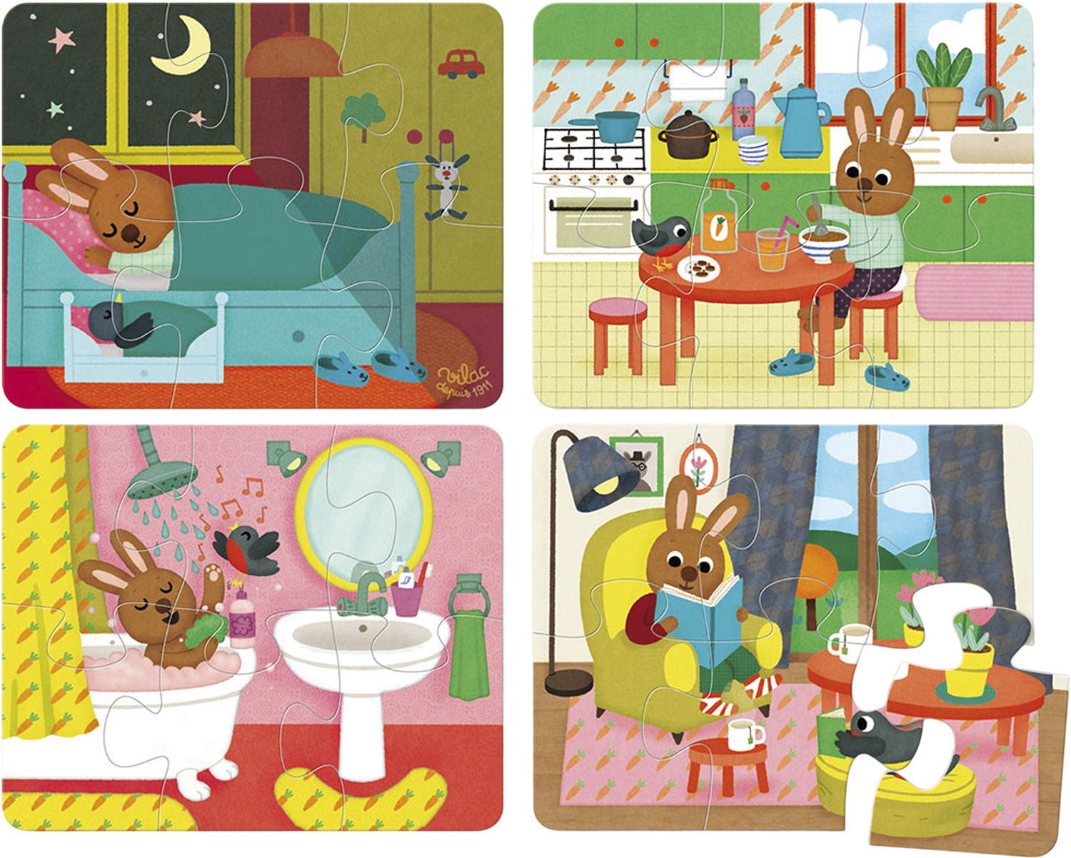 Puslespil i træ med fire scener fra hjemmet. Den lille kanin sover i sin seng, spiser morgenmad, tager et brusebad og læser en god historie.Pakket i en praktisk trææske med snor-håndtag, så det er let at tage med sig.4 forskellige puslespil, 6 stykker for
