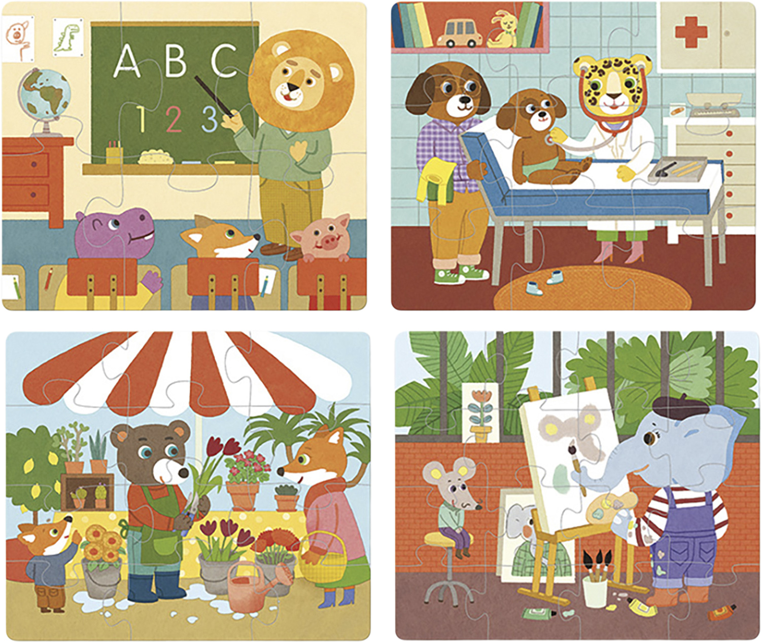 4 puslespil i trę med 4 forskellige jobs: Blomsterhandler, lęrer, lęge og kunstner.hhv. 6, 9, 12 og 16 brikker.Leveres i fin tręęske med skydelåg.Produkt: 18 x 15 x 0,4 cmEmballage: 21 x 18 x 4,5 cm.Alder: 3+