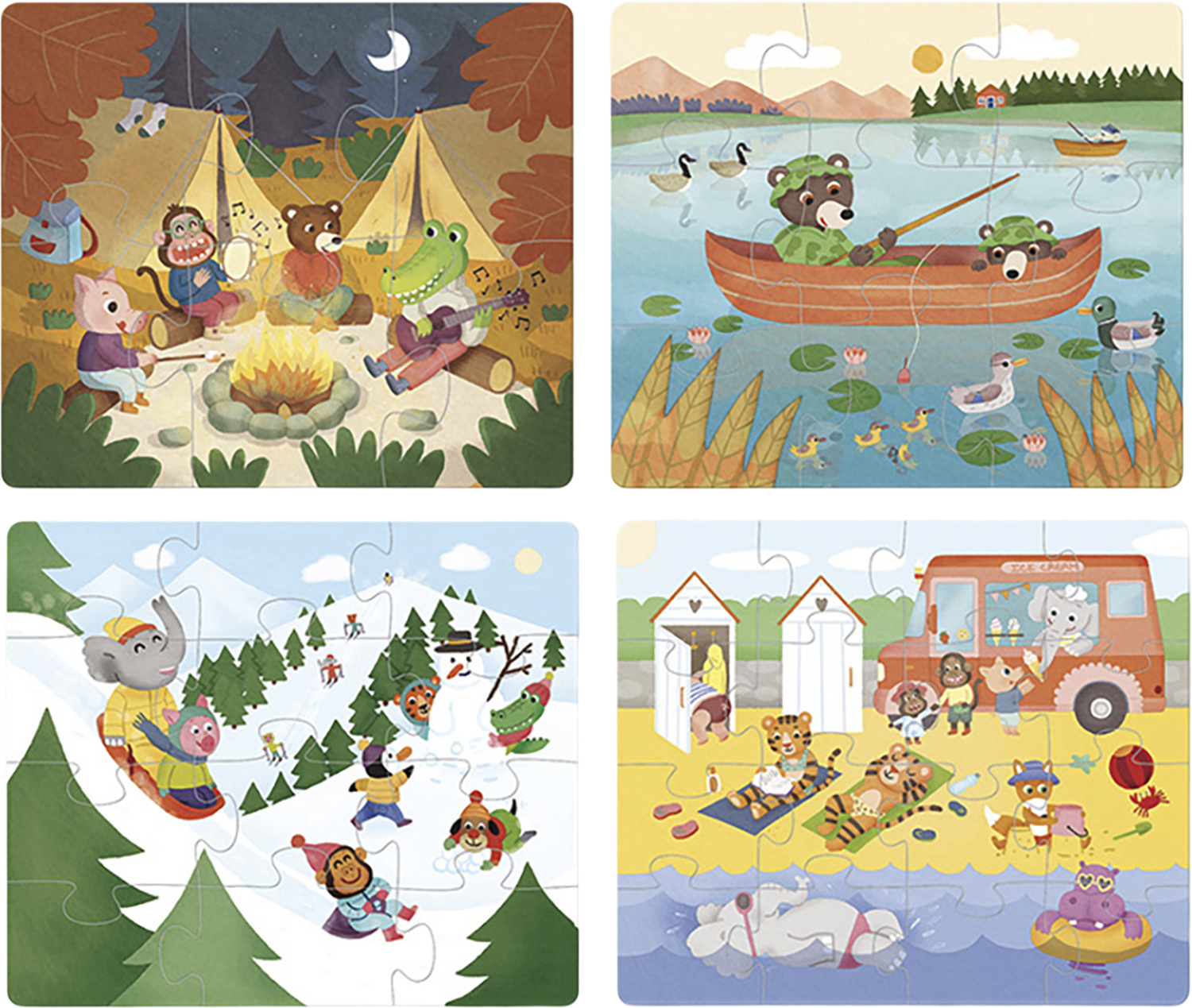 4 puslespil i træ 4 forskellige former for ferie: Skiferie, Campingferie, sejltur og strandferie.hhv. 6, 9, 12 og 16 brikker.Leveres i fin trææske med skydelåg.Materiale: TræProdukt: 18 x 15 x 0,4 cm.Emballage: 21 x 18 x 4,5 cm.Alder: 3+
