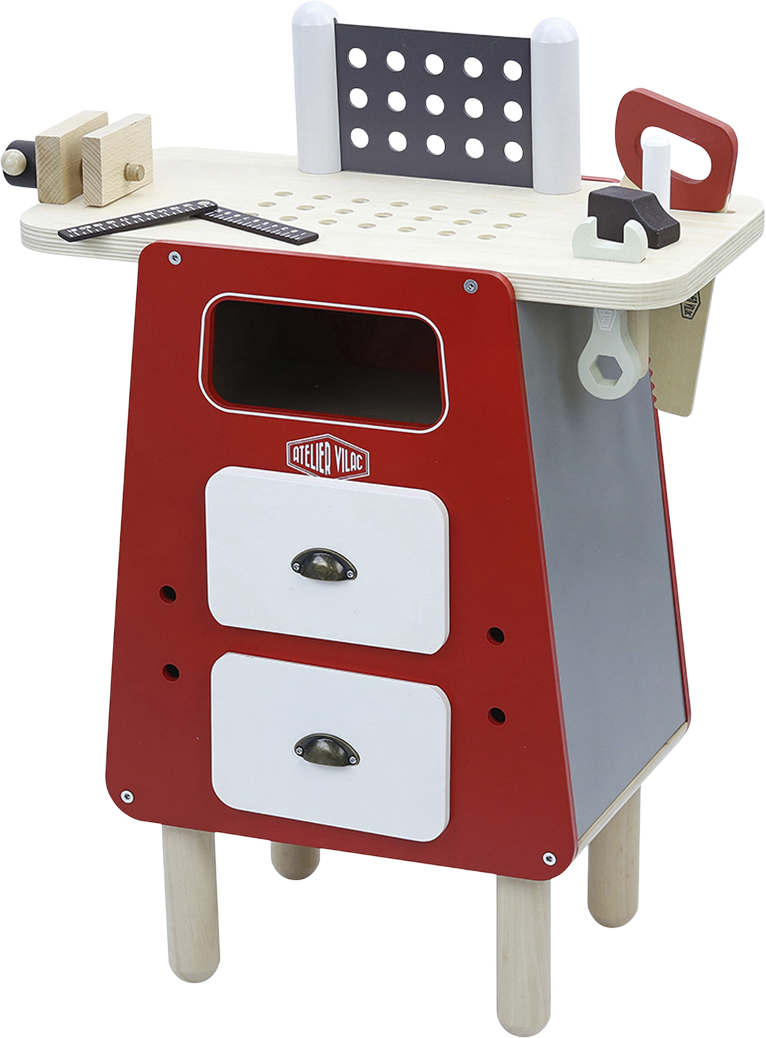 En fin arbejdsbænk med et vintage look. Den leveres med værktøj, tilbehør og instruktioner til at bygge 4 forskellige konstruktioner.Velkommen til Vilacs workshop.Denne originale træbænk med sit vintage look giver barnet mulighed for at lave ting ligesom