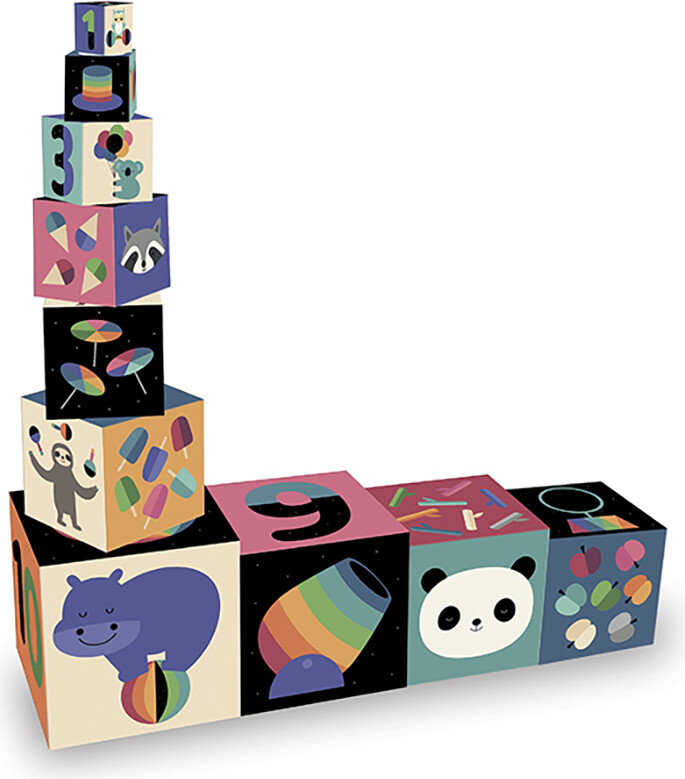 10 kraftige stableklodser i pap, som er illustreret med poetiske regnbuefarver og sjove...