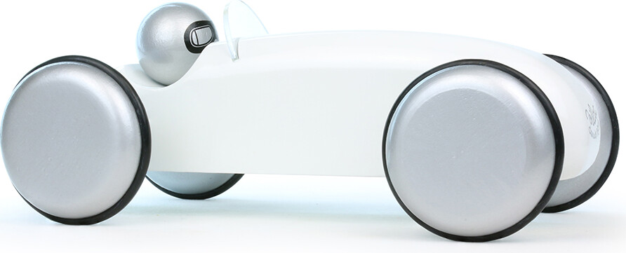 En flot bygget racerbil med slank karosseri og store sølvhjul, udstyret med racerkører i...