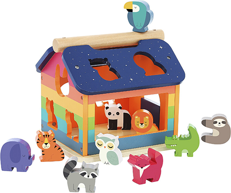 Puttekasse udformet som et hus i regnbuens farver og fyldt med 10 forskellige jungledyr, poetisk...