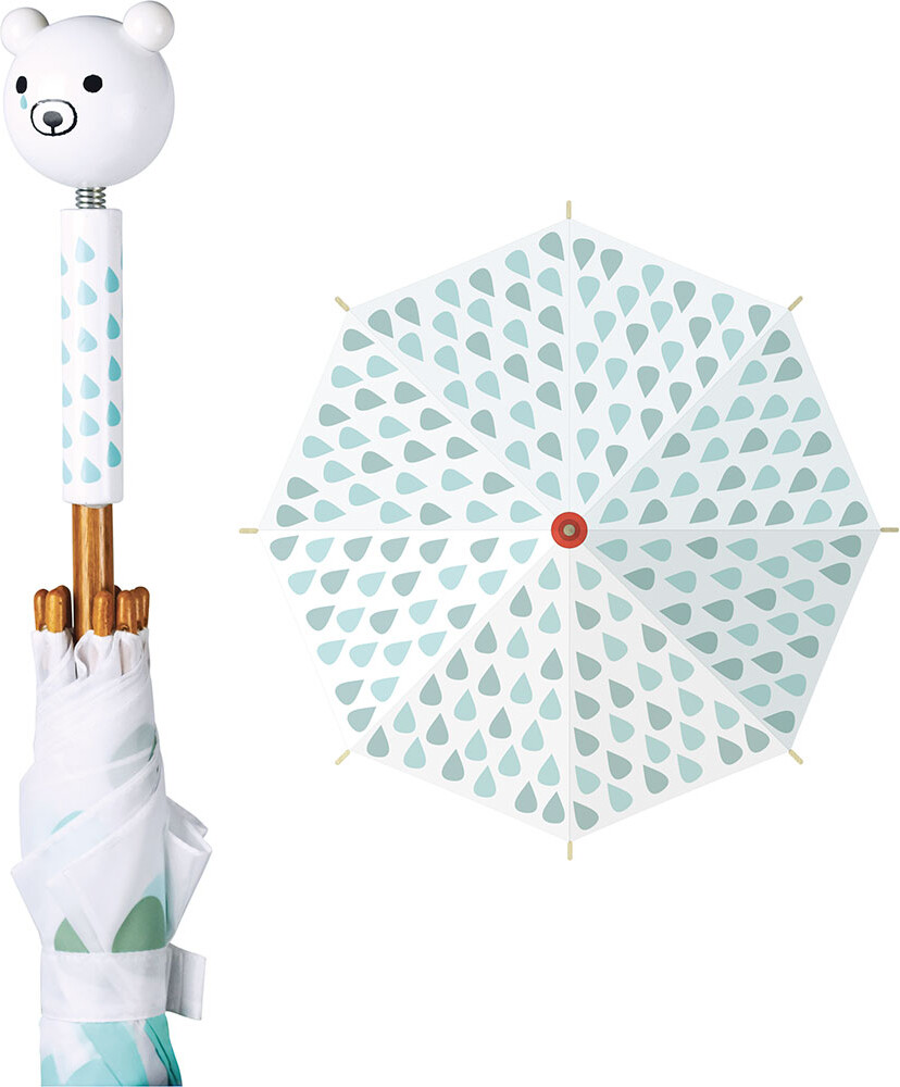 Sora Bjørn paraply dekoreret med mintfarvede dråber og et fint hvidt bamsehåndtag, designet af...