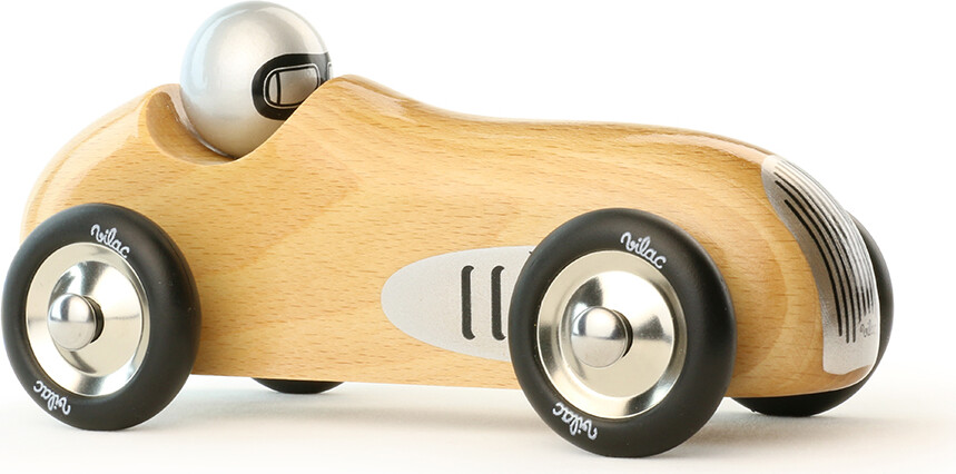 Lækker racebil i træ med sølvfælge og racerkører. Elegant og gammeldags. Produceret i...