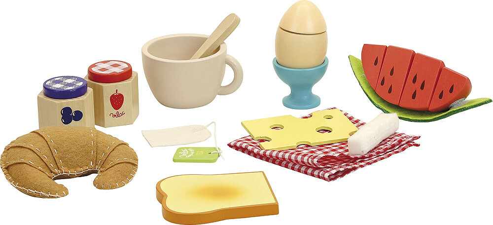 Morgenmad med et ęg, toppen kan skęres af, med teske, 1 brųd med ost, en croissant, 2 små...