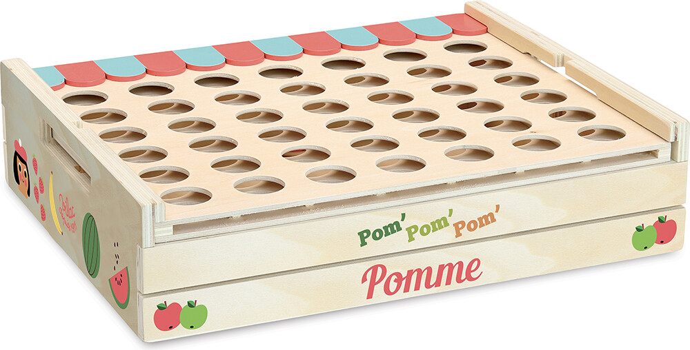 Træspil - 4 på stribe med røde og grønne æbler. Lad en brik trille ned fra toppen, så den...