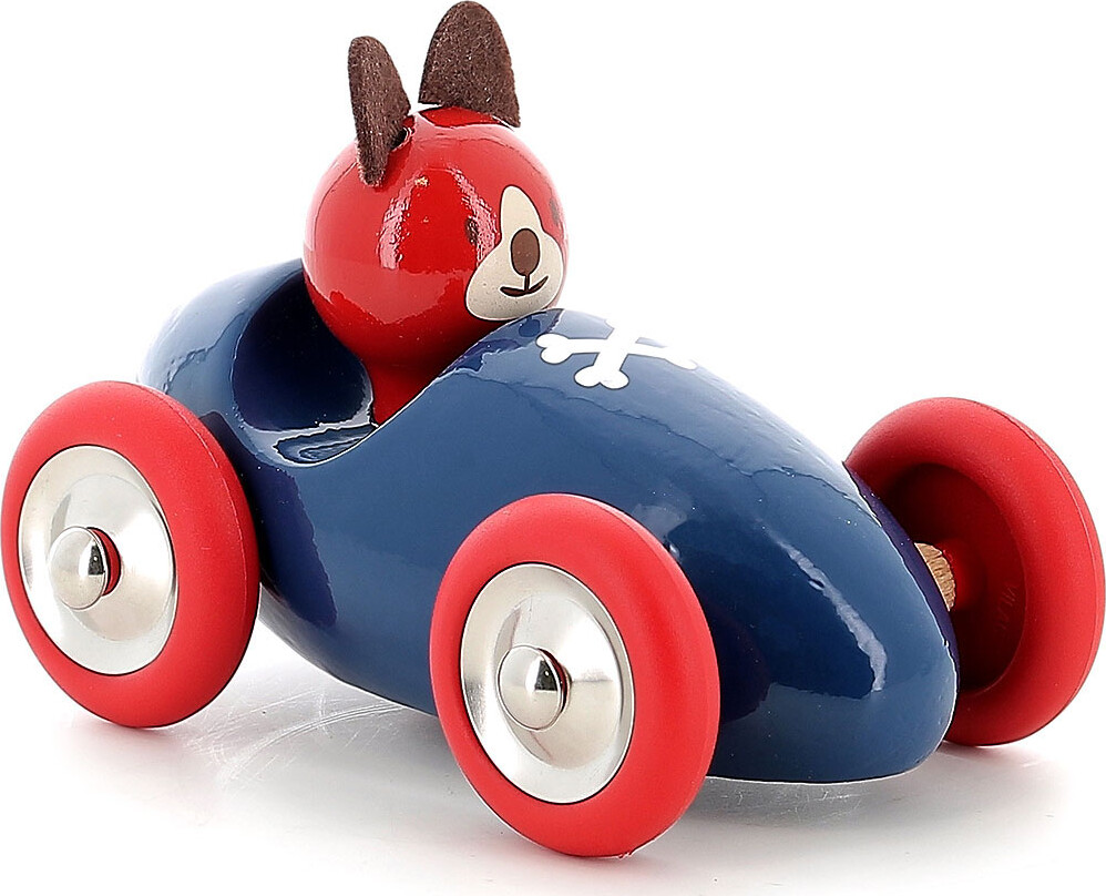 Denne træbil har en sjov figur som chauffør og den er fremstillet med en eksklusiv lakeret finish...