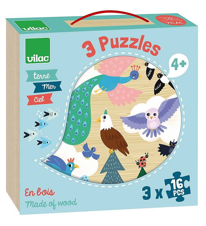 Vilac Puslespil - 3x16 Brikker - I Luften, I Vandet og På Jorden