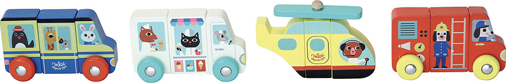 Lastbil, bus, brandbil og helikopter i træ, man kan sætte sammen, som man vil. 12 magnetiske...