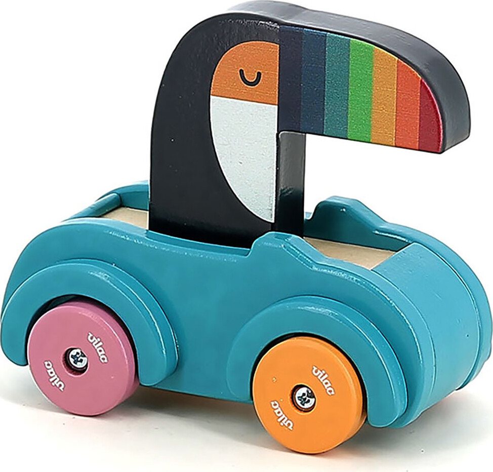 Blå træbil med farvede hjul og en sjov tukan med regnbuenæb. Bilen er designet til børn fra 18...