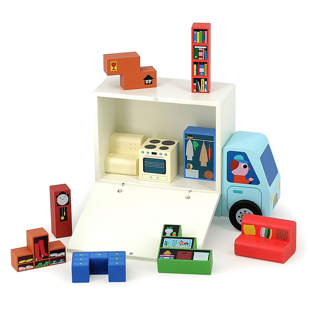 Skønt familiespil af træ, hvor det gælder om at læses flyttebilen, så alle tingene kan være der. Både små og store kan være med, og det tager kun omkring 10 minutter at spille. Spillet kan tåle mange års leg, og det er også ideelt til institutioner. Man behøver ikke at kunne læse eller tælle for at være med.