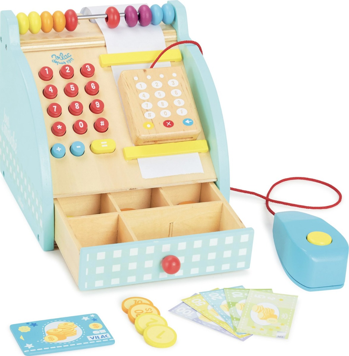 Vilac - Kasseapparat i trę - 25 dele. Er velegnet til Fantasi,Rolleleg,Tal- og męngdeforståelse og passer til aldersgrupperne: 3 år,4 år,5 år