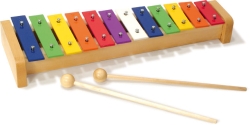 Vi synes at musikinstrumenter skal have rigtig lyd. Hvorfor skal børn finde sig i dårlig lyd og ikke rigtige toner, bare fordi de er børn?Denne xylofon i metal, kommer så tæt på rigtige toner, som man kan, når nu det også er et legetøj. Alle toner er farve indikeret, så man evt. kan lære sig melodier i farver.Dette er legetøj, som giver dit barn fornemmelsen af årsag og virkning i musikalsk sammenhæng. Det er ikke et rigtigt instrument, og det kan ikke sammenlignes tonalt med et rigtigt instrument. Oplagt gave til små spektakelmagere.