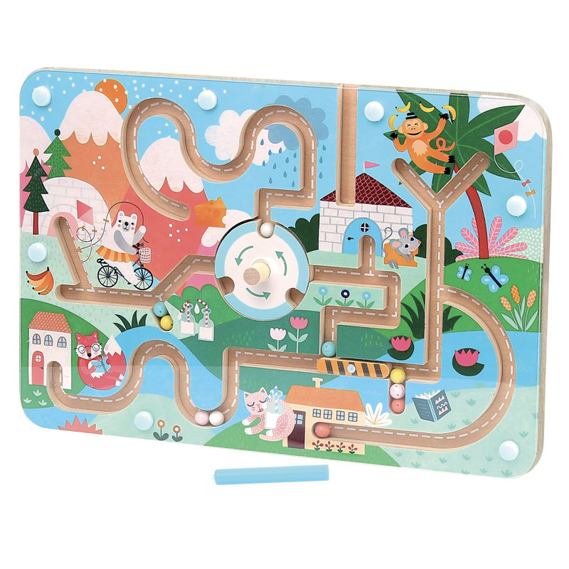Fang en kugle med den magnetiske tryllestav. Med den kan du føre kuglen rundt gennem hele labyrinten. Skal den ned i husest allernederst eller helt op i bjergene? Måske skal hjulet i midten drejes, inden kuglen kan nå helt frem.Det styrker dit barns evne til problemløsning og at overskue det store motiv, når kuglen skal et særligt sted hen og ikke kun bevæger sig tilfældigt rundt.Her kan I virkelig snakke om forholdsord, når kuglen kører op og ned og rundt til byens punkter øverst og nederst, oven over, hen imod eller nedenunder noget. Og det er ellers ord, som godt kan være temmelig abstrakte at lære og holde styr på som barn.