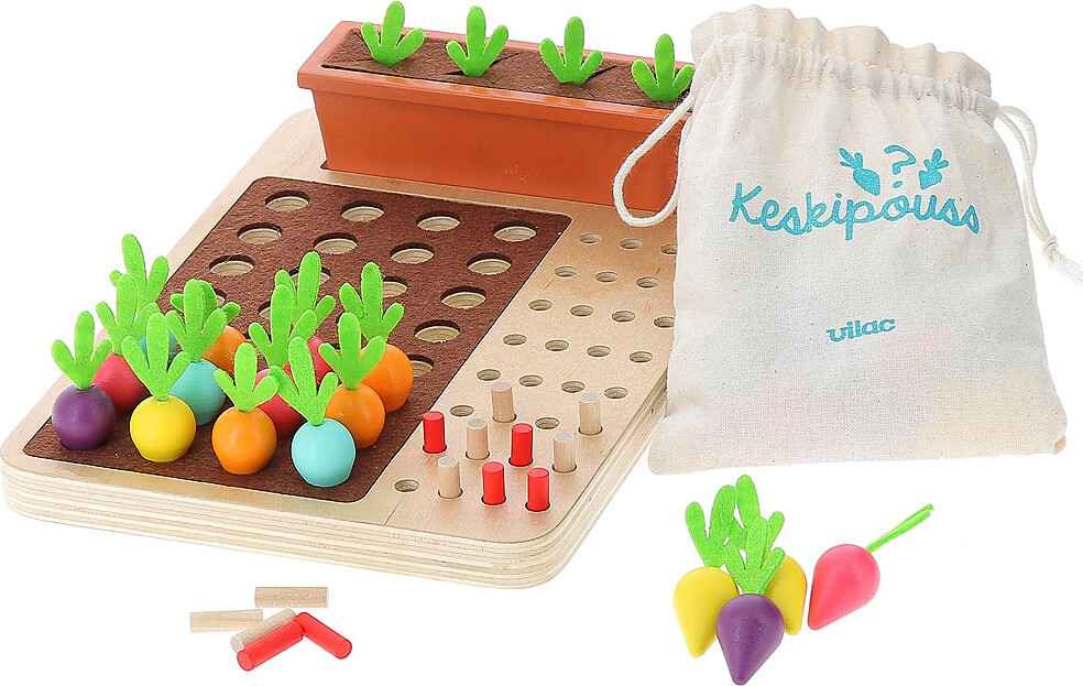Introducer dine børn for sjov og læring med Vilac - Kodespil - Grøntsager I Haven. Dette farverige træspil er designet til at stimulere børns fantasi og motoriske færdigheder, mens de leger med søde grøntsager fra haven.