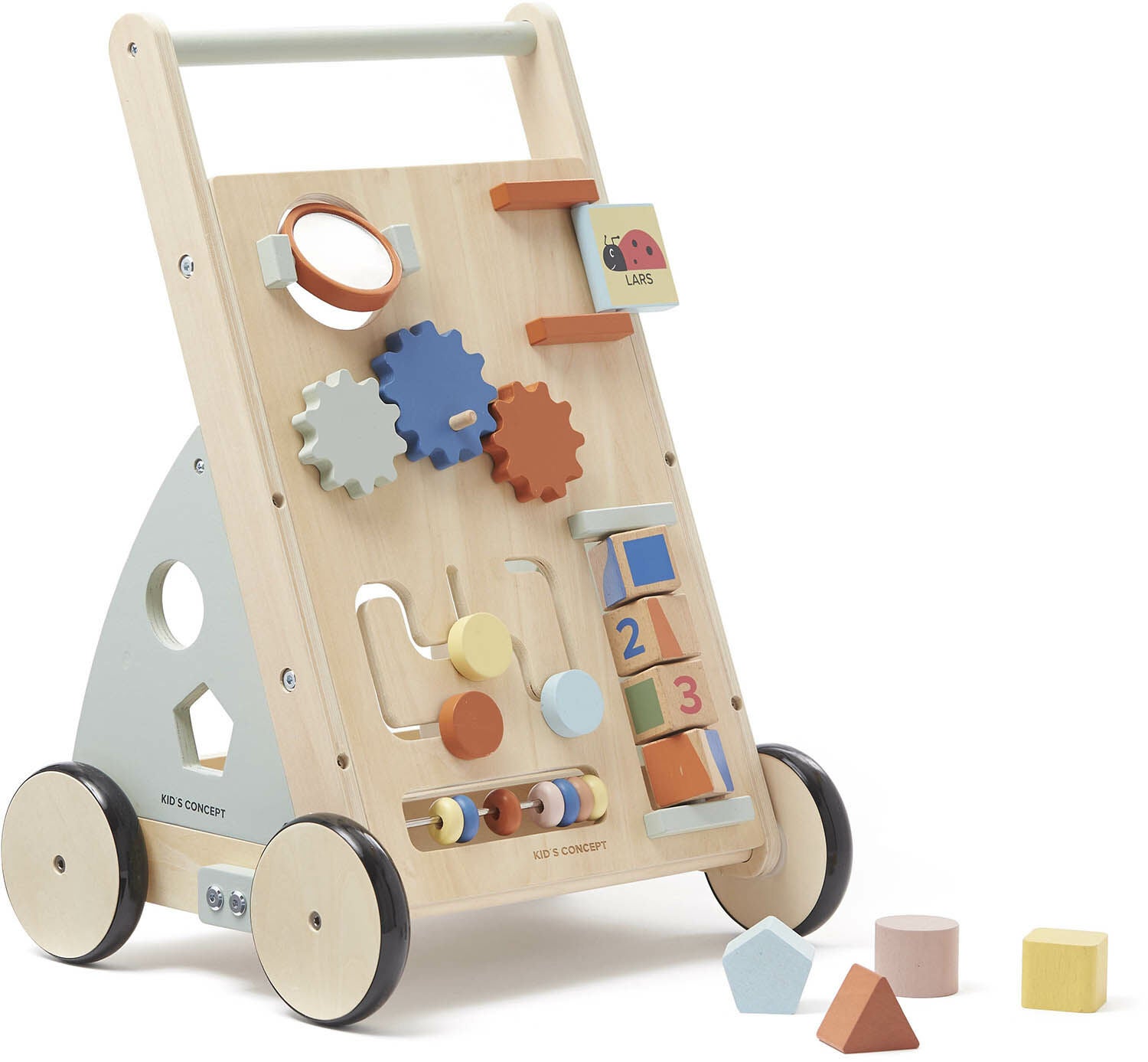 Aktivitetsvogn fra Kids Concept i FSC-certificeret træ med mange, sjove funktioner. Den har en aktivitetstavle, som kan tages af eller på med hjælp af en skrue, og fire farverige klodser, som man skal prøve at matche med hullerne på siden af vognen. Aktivitetsvognen har fire hjul med en gummiring, der reducerer lyd og risikoen for at få mærker på gulvet, og bremser på forhjulene. Perfekt til at stimulere dit barns udvikling og indlæring. CE-mærket. Anbefalet alder: Fra 12 måneder.