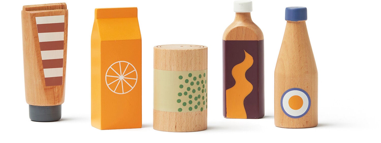 Kid's Hub flaske- & dåsesæt fra Kids Concept i træ. Det har fem flasker og en dåse i FSC-certificeret træ. Perfekt til timevis af fantasifuld leg. Indeholder: 1 appelsinjuice, 1 ærtedåse, 1 stærk sauce, 1 sovseflaske, 1 ketchupflaske. CE-mærket. Anbefalet alder: Fra 3 år. Bøgetræ.