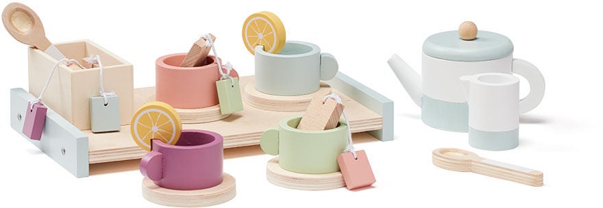Et fint tesæt fra Kids Concept, så dit barn kan invitere alle vennerne til teselskab. Vælg mellem fire forskellige teposer, sæt den lille citronskive fast på kopkanten, hæld en smule mælk i og servér kopperne på bakken. Sættet består af 21 dele en tekande med låg, fire kopper med underkopper, fire forskellige teposer, to citronskiver, en boks til teposerne, to teskeer, et skærebræt og en boks, som du kan opbevare hele sættet i. Anbefalet alder: Fra 3 år.