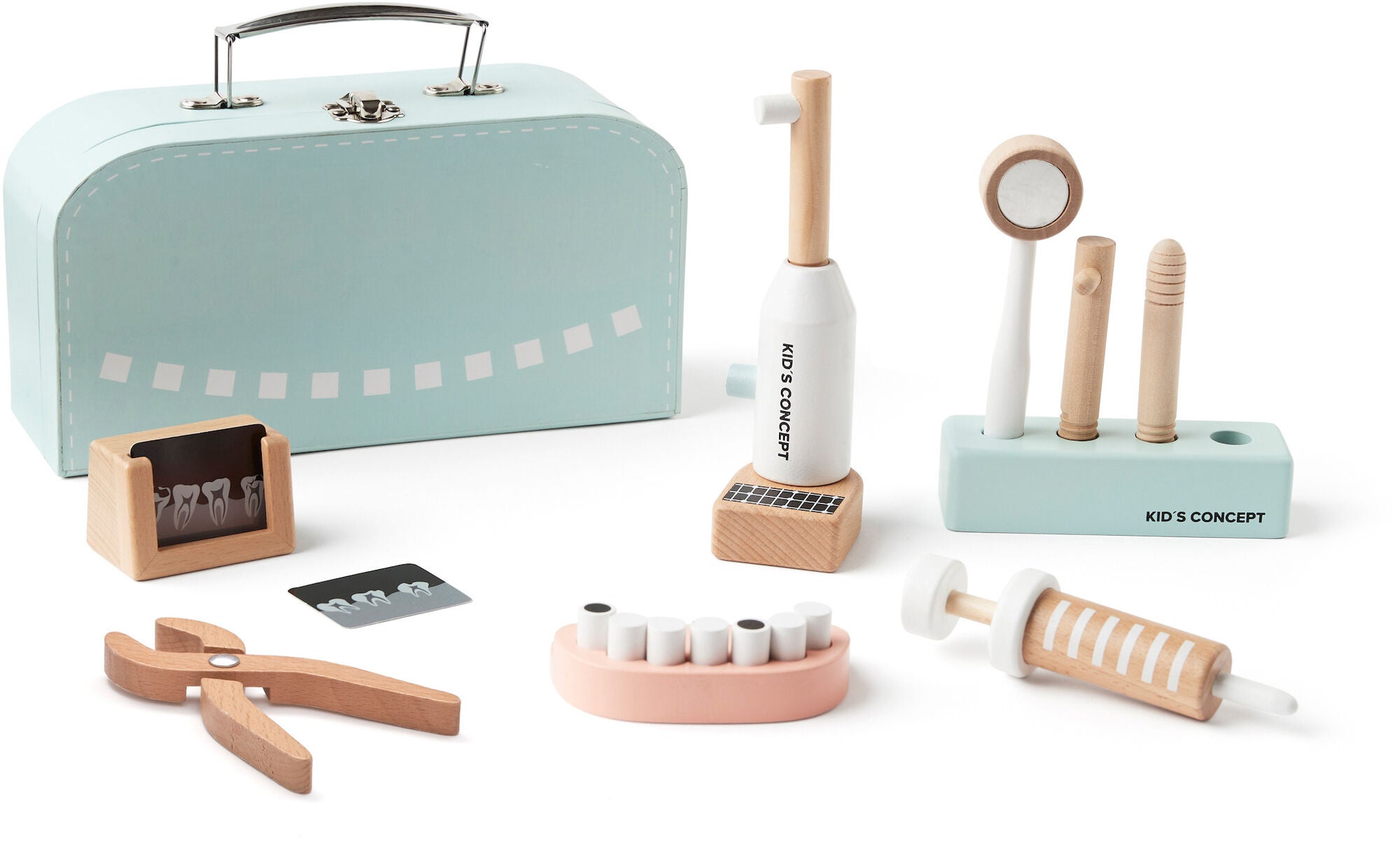 Tandlægesæt fra Kids Concept i træ. Det har 19 spændende dele og fire tandlægeværktøj. Tandlægesættet har syv udtagelige tænder, et røntgenkamera og to røntgenbilleder. Det har en praktisk taske til opbevaring af alt tilbehør. Perfekt til timevis af fantasifuld leg. CE-mærket. Anbefalet alder: Fra 3 år. FSC-certificeret træ, MDF, karton.