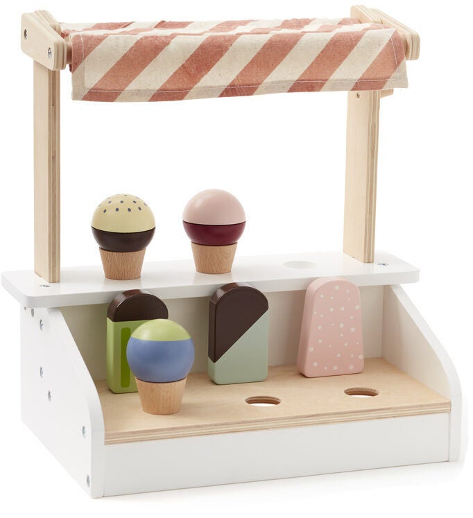 Farverig isbod fra serien Bistro fra Kids Concept. Invitér familie og venner på is! Sættet indeholder 6 is, hvoraf to kan tages fra hinanden og sættes sammen. Den lille markise i bomuld beskytter isene mod solens stråler. Anbefalet alder: Fra 3 år