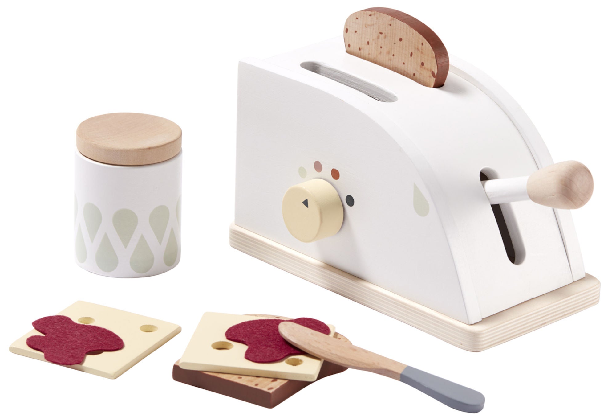 Brødrister fra Kids Concept et sjovt, lille sæt til dit barns legekøkken. Brødristeren og de øvrige produkter i pakken er lavet af kvalitetstræ, som holder til leg i årevis, og de er så fine, at de sagtens kan stå fremme og pynte, når man ikke leger med dem. Sættet indeholder: - Brødrister - To knive - Skål - To skiver ost - To syltetøjsglas - Smørkniv
