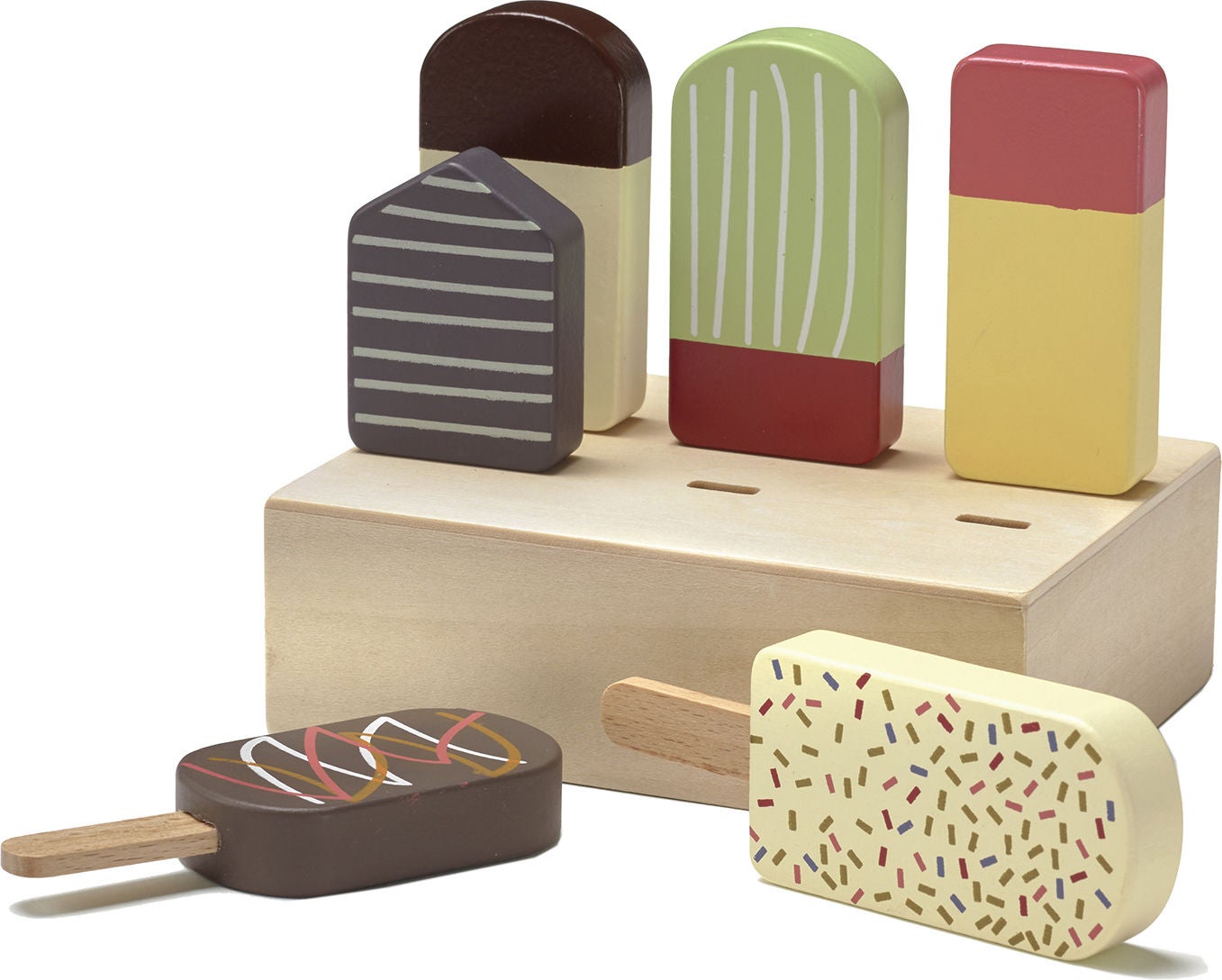 Sjove ispinde af træ fra Kids Concept. I dette sæt får du seks ispinde, et isstativ og en kasse til at lægge dem i. Perfekte til at lege butik eller skovtur med!
