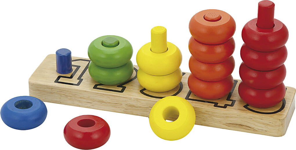 Med dette legetøj i træ fra Viga kan børn lære at stable og tælle samt genkende farver og former, imens deres taktile sans stimuleres og finmotorikken styrkes. Sættet består af et tællebræt...