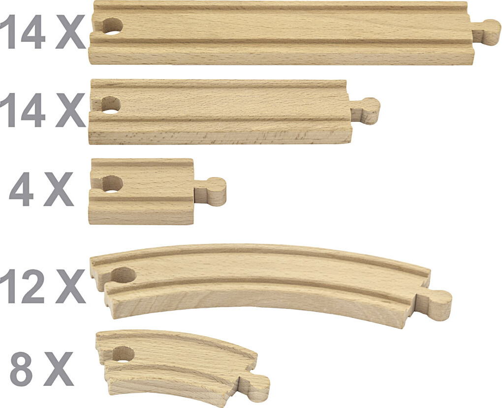 Viga's Togbane - Togskinner - 52 Dele er det perfekte sæt, til børn der elsker tog og togbaner. Dette sæt består af 52 dele af robust træ, der kan sættes sammen til en vilkårlig togbane....