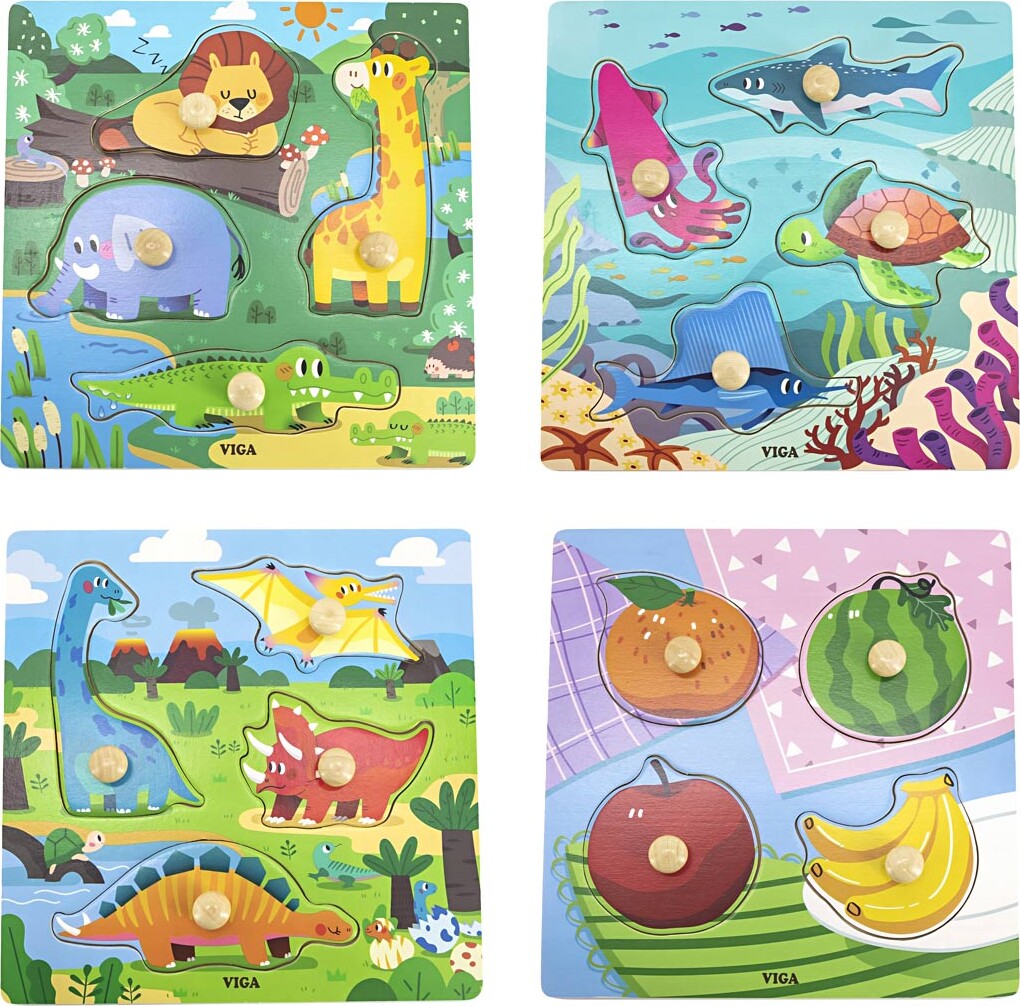 Viga Puslespil I Trę - Dyr Og Frugter - Knoppuslespil - 4x4 Brikker