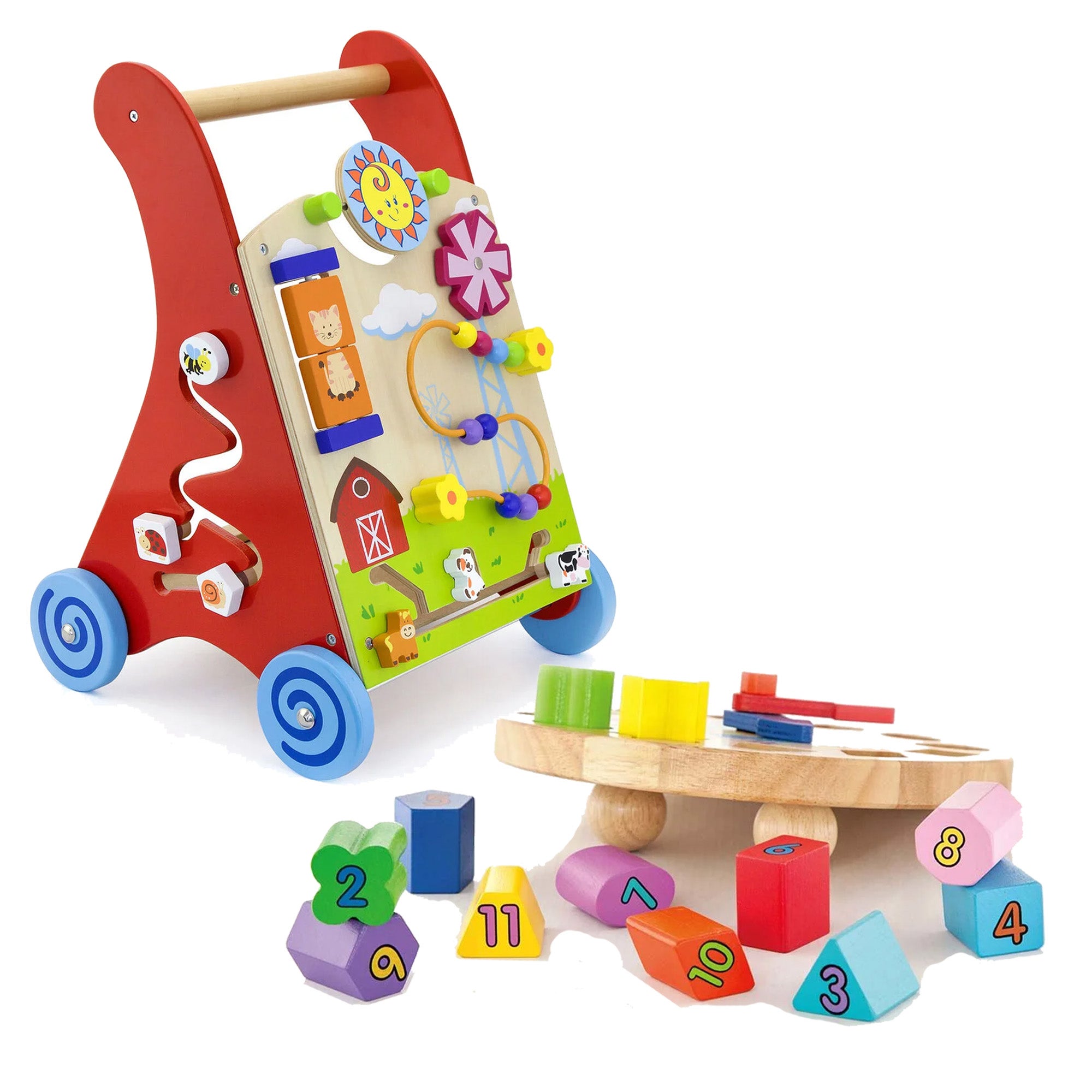 Pakke med to stykker legetøj fra VIGA: En gåvogn og et ur. Gåvognen er sjov, stimulerende og hjælper dit barn med balancen, når det er ved at lære at gå. Gåvognen er fremstillet af træ af højeste kvalitet og håndmalet. Den har fire hjul og er dekoreret med flotte detaljer, der giver den et sjovt udseende med bondegårstema. Denne gåvogn er kombineret med skægt aktivitetslegetøj, så dit barn kan udvikle både sanser og motorik. Uret er også et træpuslespil et flot legetøjssæt med træklodser og en urplade, så dit barn selv kan samle sit ur. Træpuslespillet er fantastisk til at lære farver, former, tal og mængder. Dette er både et farverigt, underholdende og gedigent stykke legetøj fra VIGA til de mindste børn og det er malet med miljøvenlig farve som opfylder EU-standard. Klik på respektive produkt for mere information.
