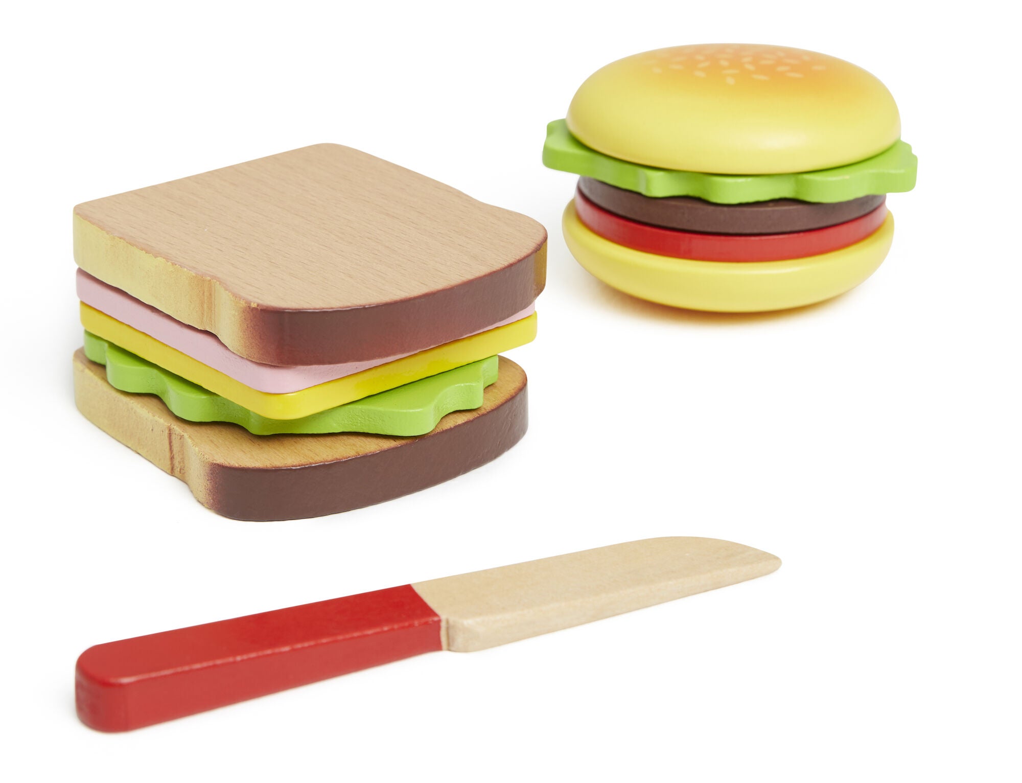 Fantasifuldt legesæt fra VIGA med et legende design. Det har en kniv og ti dele med velcro til at lave en hamburger og sandwich med. Perfekt til træning af dit barns koordination og finmotorik. Indeholder en kniv og 10 dele til at lave en hamburger og en sandwich med. CE-mærket. Anbefalet alder: Fra 1,5 år.