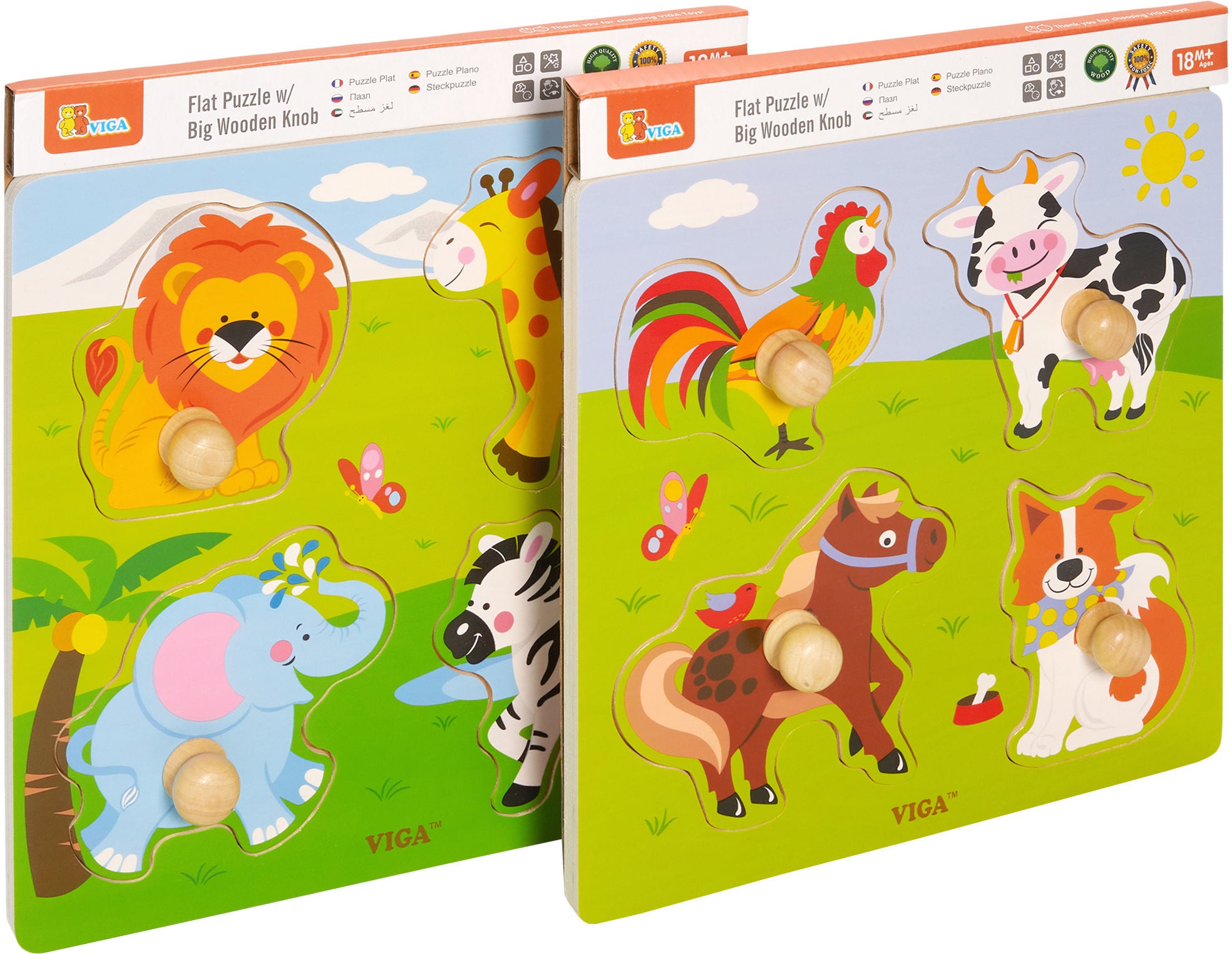 To knoppuslespil fra VIGA med dyremotiver, der er perfekte til den lille, der kan lide dyr og gerne vil have en udfordring. Dette pædagogiske puslespil udvikler koordination, motorik og problemløsning. Anbefalet alder: Fra 18 mdr.